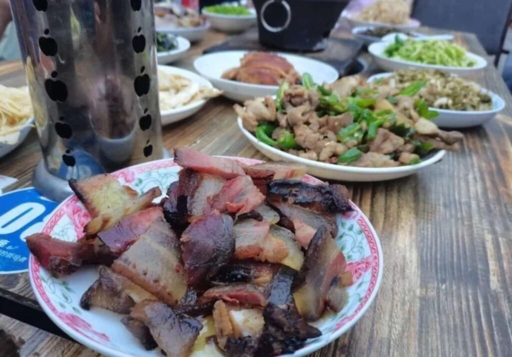 What left the deepest impression were the wooden houses in the mountains, the crystal-clear streams, the local pork, cured pork feet, and baked potatoes. The pigs raised by the mountain villagers, along with the cured meat and pork feet, were laid out on long tables. I asked the elderly villager, “Are these potatoes chopped up for the pigs to eat?” The old man replied, “Yes, a large basin every morning.” The wooden houses and roofs made of tree bark At 7 PM, the bonfire party begins, with karaoke, tea drinking, and chatting, a scene of revelry and indulgence.